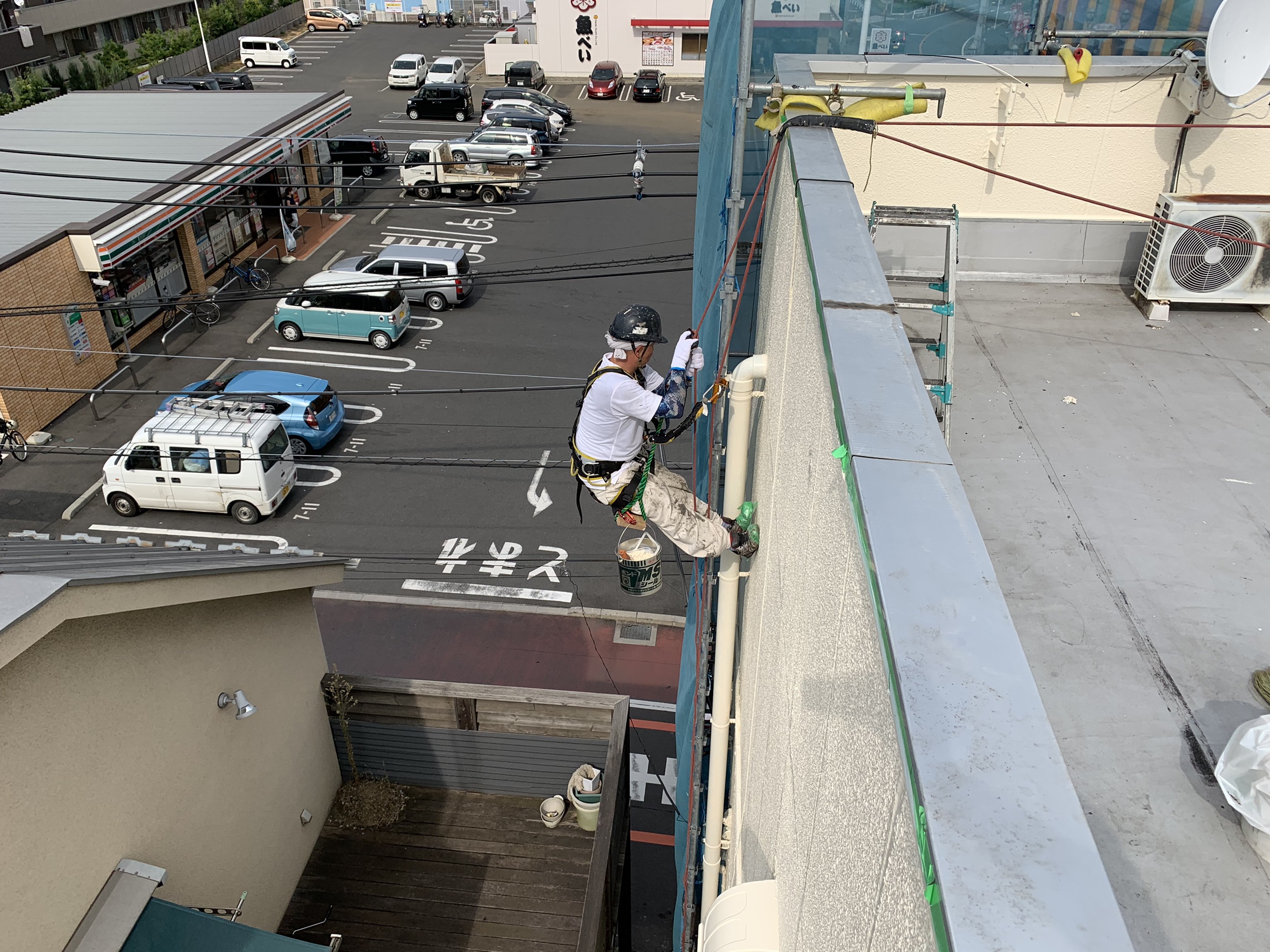 本日は少し特殊な工事のお知らせ。狭小地やビルなど、足場での作業が難しい場合、このようなブランコ作業が可能です!住宅はもちろんですが、このようなビルなども弊社手掛けております!