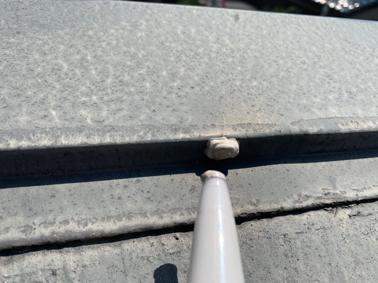 埼玉県川越市 I様邸 屋根、外壁塗装工事が着工中です。屋根塗装の前に一番重要な補修作業があります。屋根の天辺にある棟板金という箇所です。この棟板金は釘で木下地に止めているだけなので経年劣化により釘が抜けてきてしまいます。何も補修をせずに塗装をしてしまうと台風や強風時の際、屋根から飛んでしまう事があります。弊社ではしっかりと新しいステンレス釘で打ち直しをして、さらに釘抜けを防ぐ為、釘頭を全箇所コーキング材で止めます。