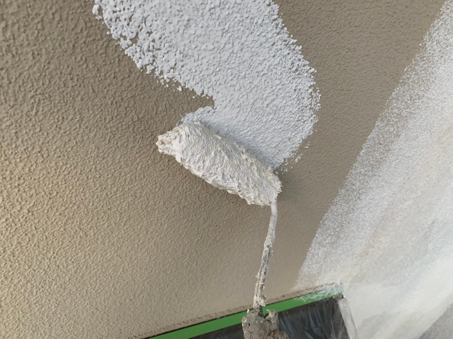 埼玉県川越市 I様邸 屋根、外壁塗装工事進行中です。先日ひび割れ部分を補修した箇所や、狭い部分も入念に下塗り材を塗装していきます。