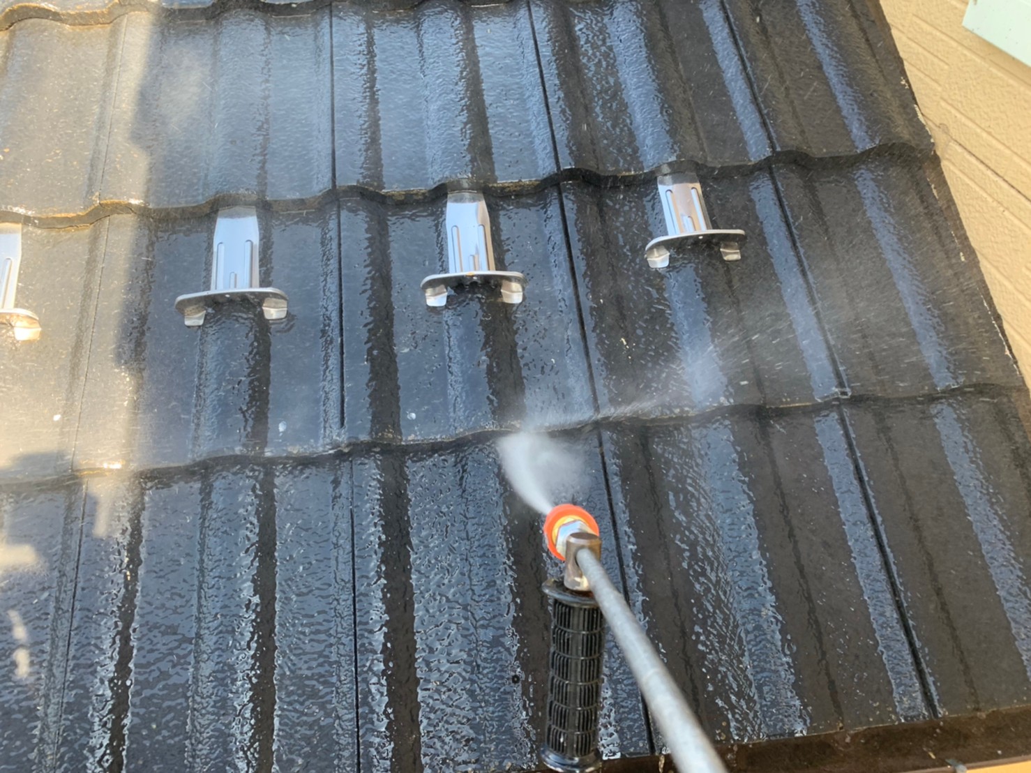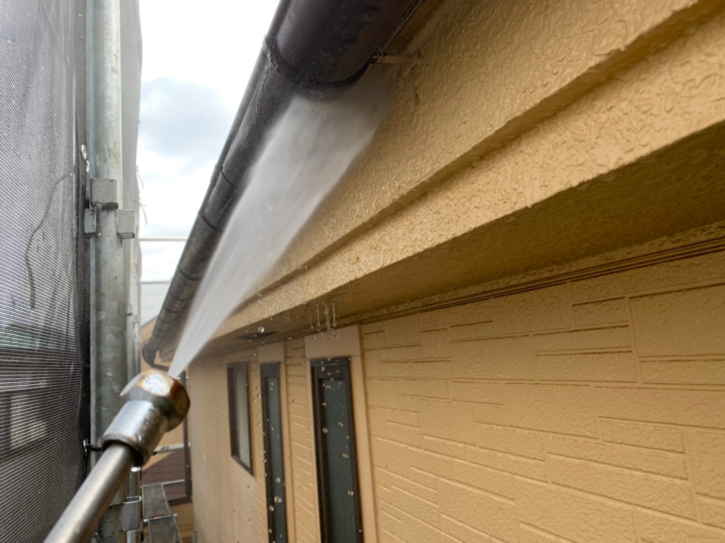 埼玉県川越市K様邸にて、高圧洗浄を屋根から雨樋、外壁から基礎部分まで洗浄をかけていきます。洗浄後今までの汚れを落として外壁塗装準備完了です。作業終了後、お客様にも見て頂き本日は作業終了となります。