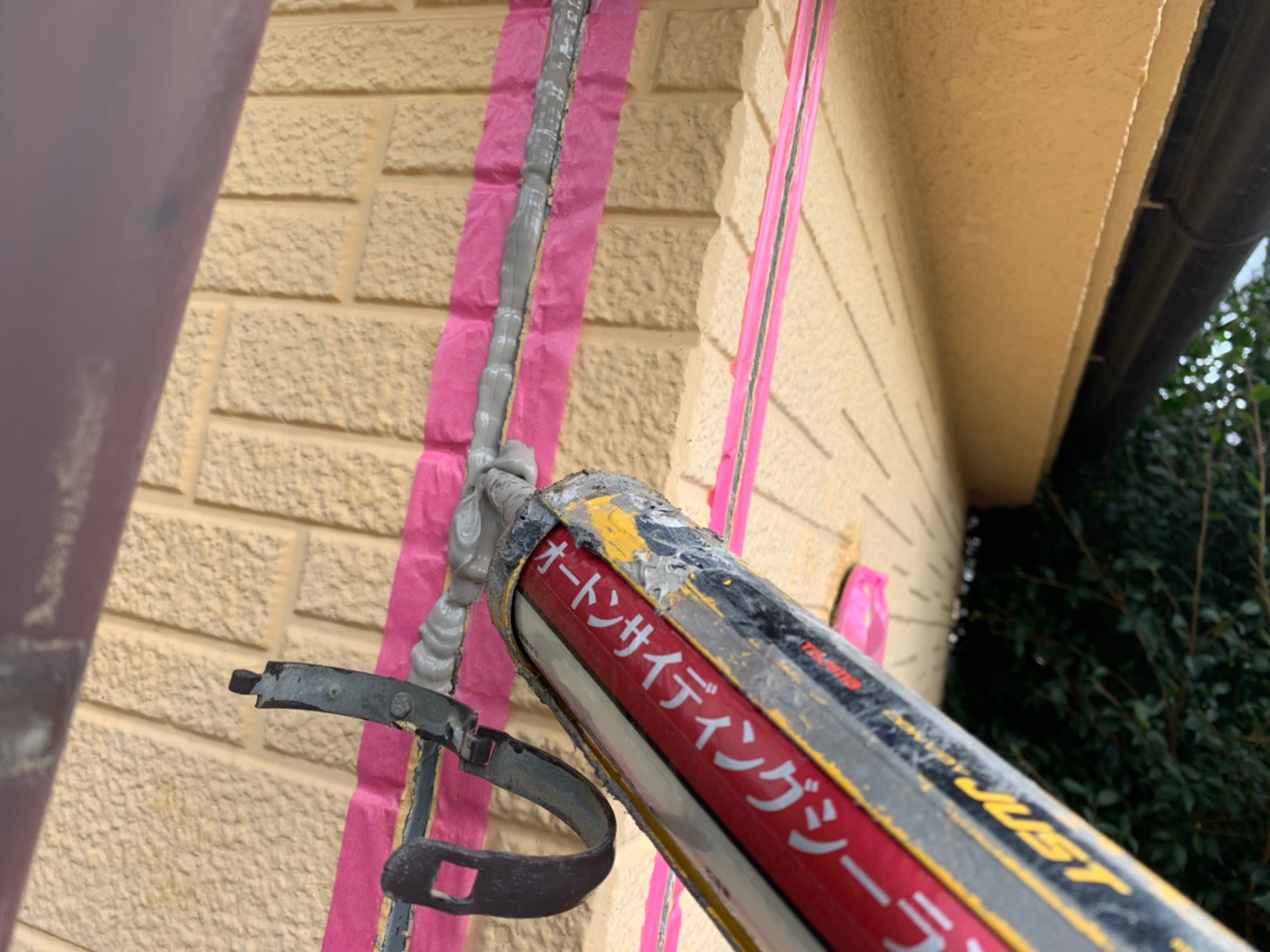 外壁補修、コーキングの準備と実際に仕上げていきます。
