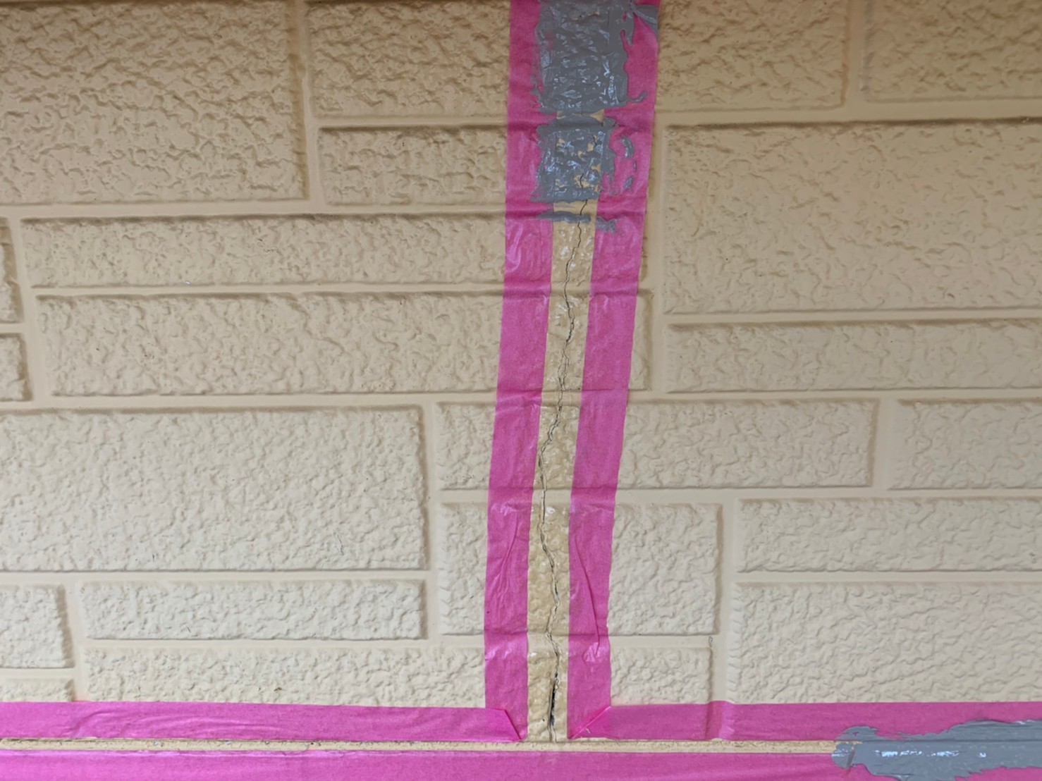 古くなったコーキング材を撤去し、外壁自体に入ってしまったひび割れもテープを貼りコーキング打ち込み準備をしていきます。