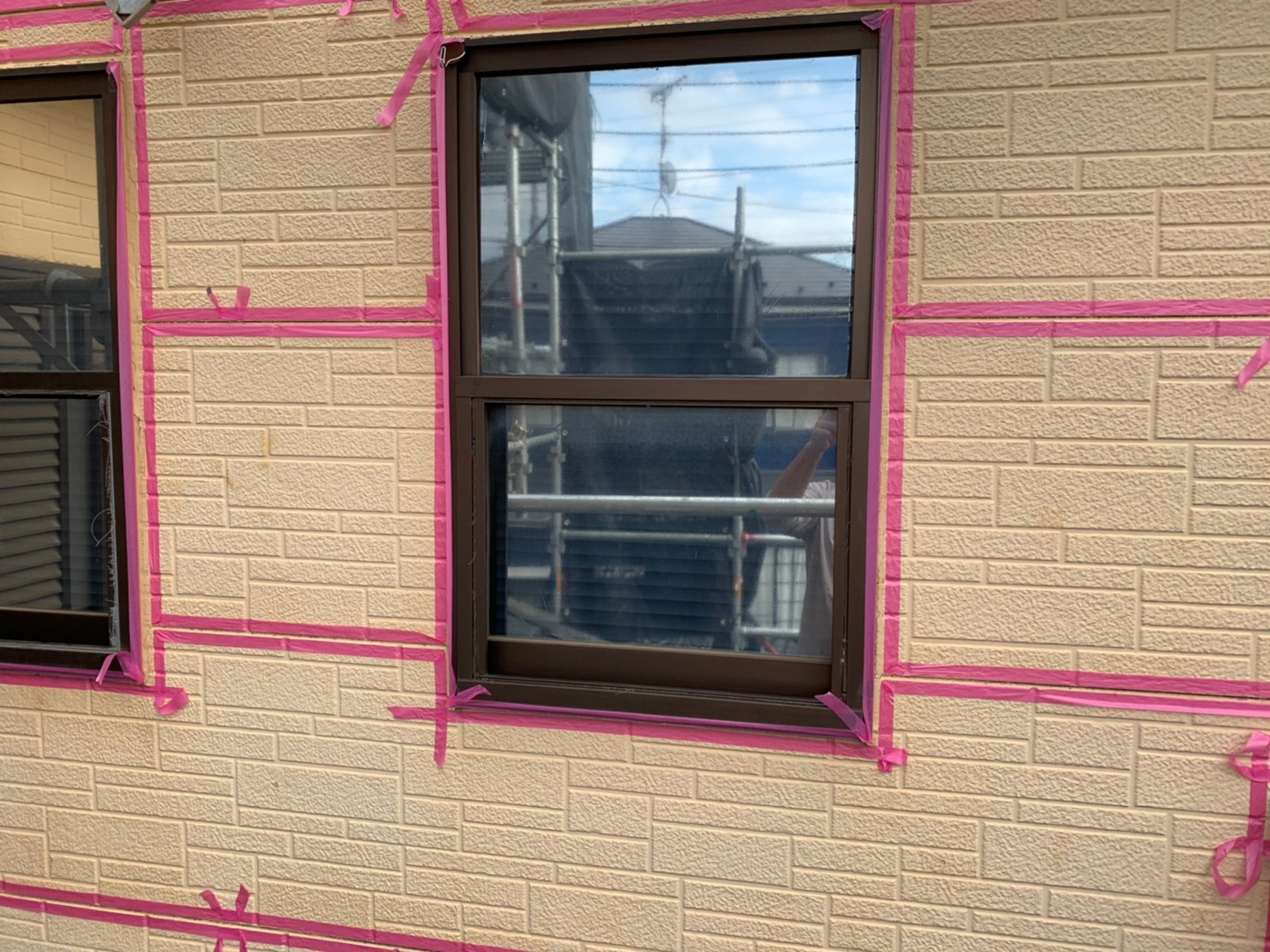 既存コーキング撤去とテープ準備完了後、専用の接着プライマーを塗布しコーキング打ち込み準備完了です。準備完了後、実際にコーキング材を縦目地・サッシまわり・外壁自体のひび割れ部分を仕上げ十分に乾燥させて塗装準備完了です。