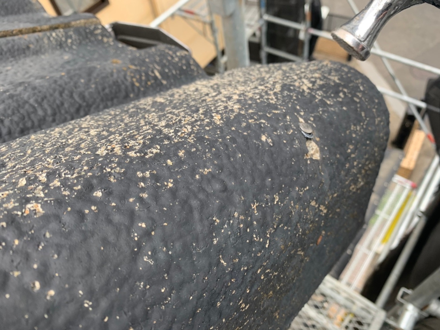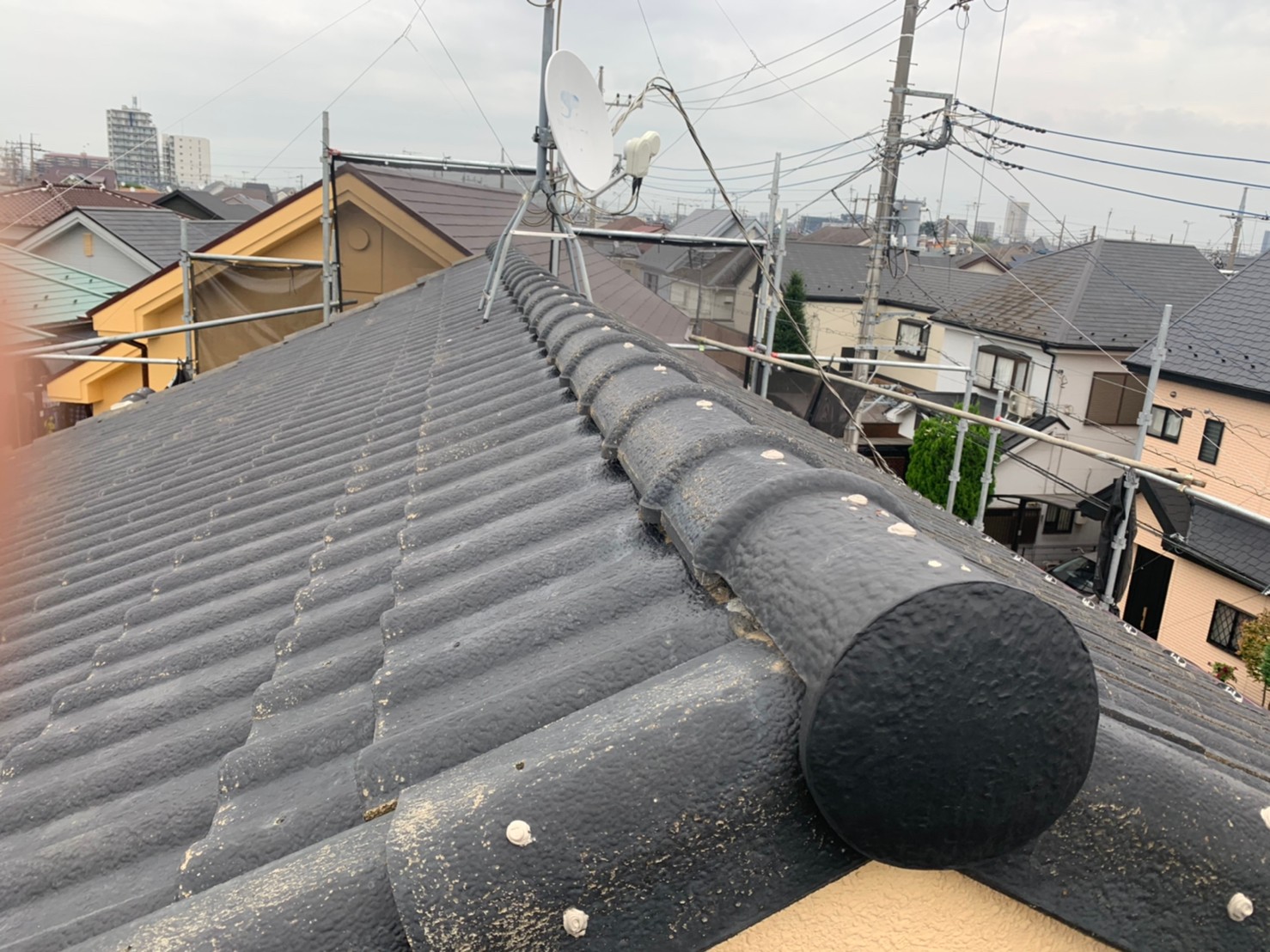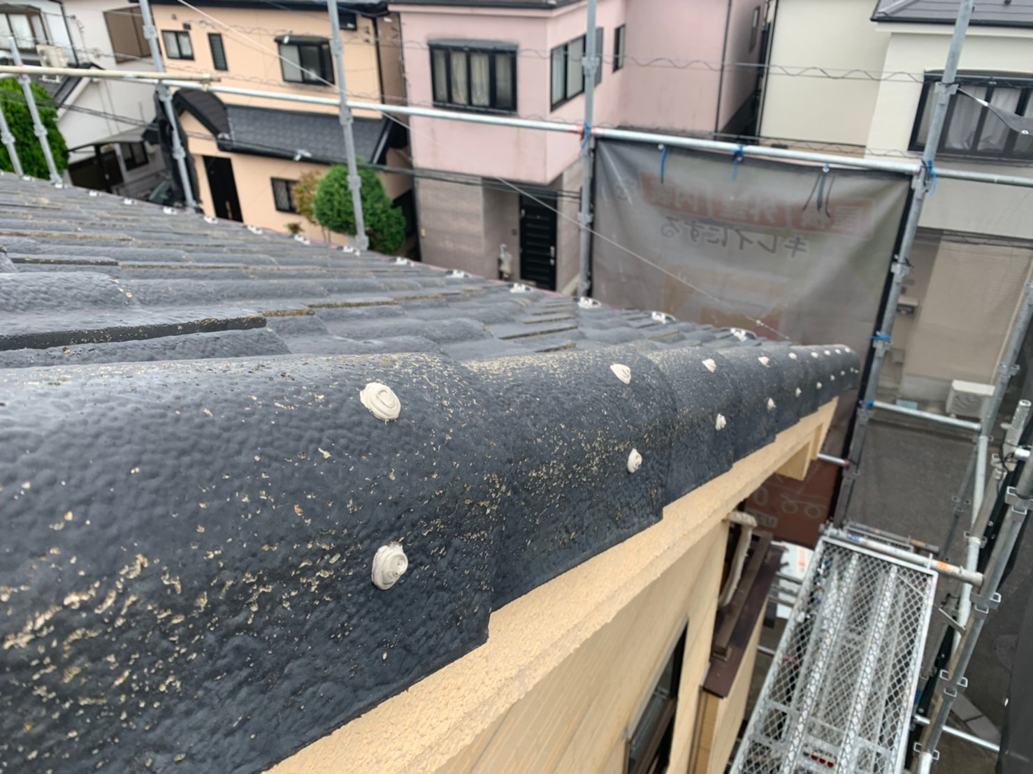 O様邸の屋根は洋瓦で、現場調査の段階では釘頭がぴょこぴょこ出ている状況でした。そのまま塗装しただけではまた釘頭が浮いてしまい、雨漏りの原因になってしまいます。なのでハンマーで釘頭を打ち、コーキング材で抑えていきます。下から見えにくいからこそ重要な作業です。明日も安全作業徹底で作業してまいります!