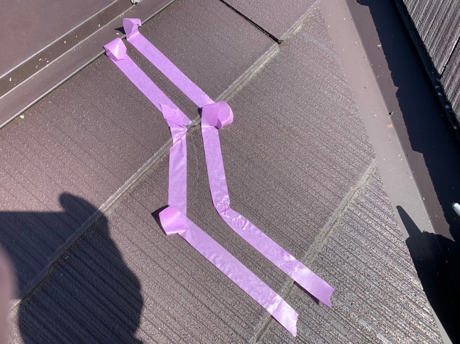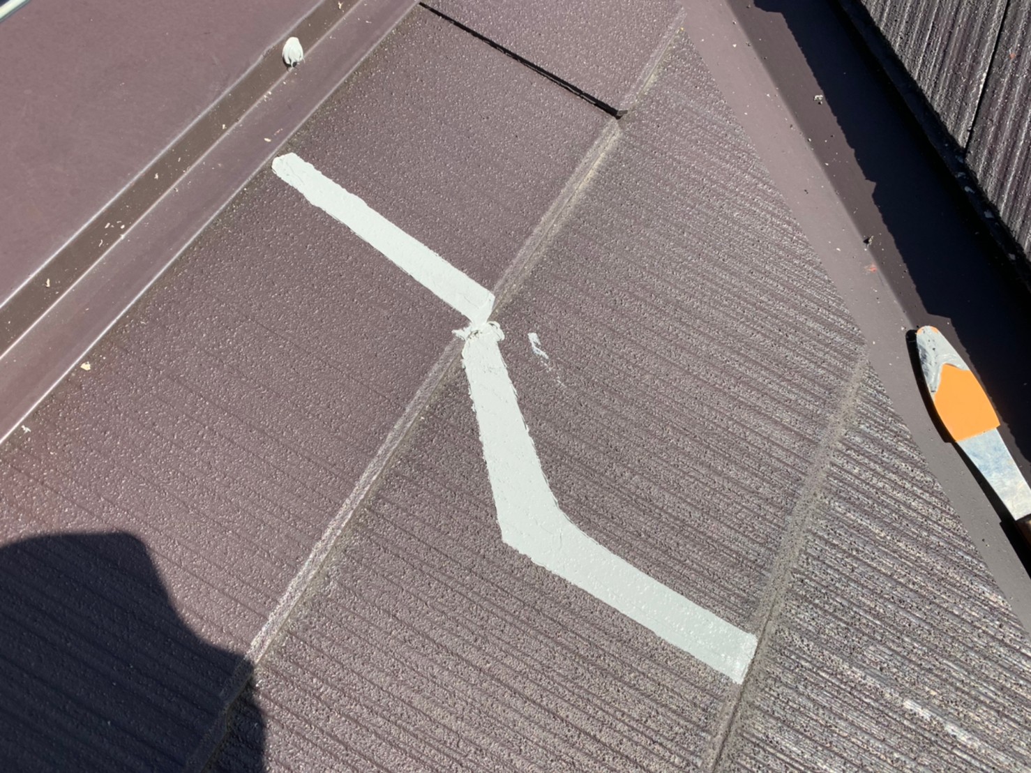 屋根の表面のヒビや割れもマスキングテープを貼りコーキング材をならしていきます。