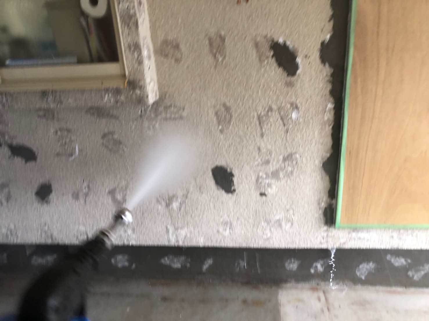 高圧洗浄で埃やコケなどの汚れをおとし、乾燥後モルタル部の補修、クラック処理(外壁ひび割れやビス穴埋め)をして塗装をかけていきます。