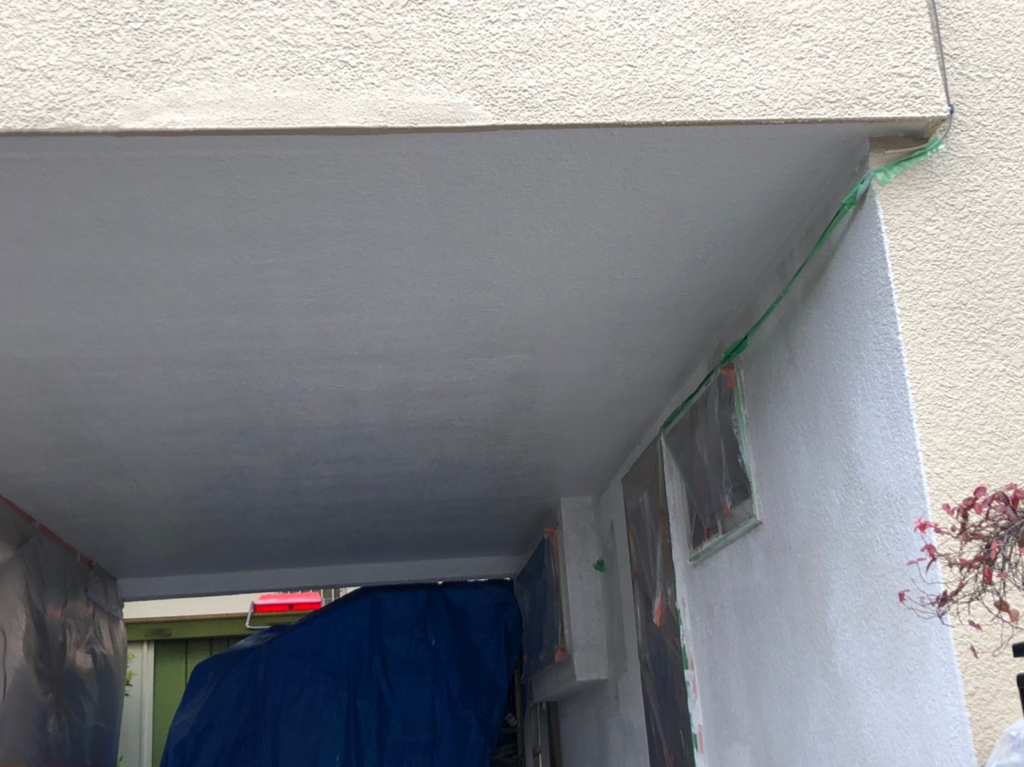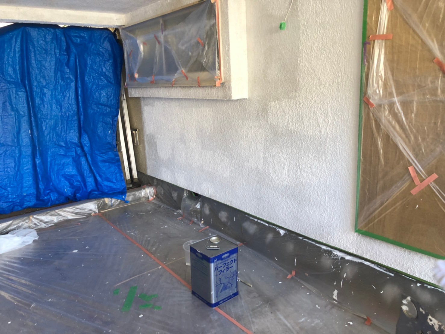 不塗装部は専用の養生テープ、養生ビニールを貼り、汚れてしまわないよう隠します。土間もすべて養生をして更なる劣化や腐食を防ぐために外壁にある小さい穴やヒビを埋めます。