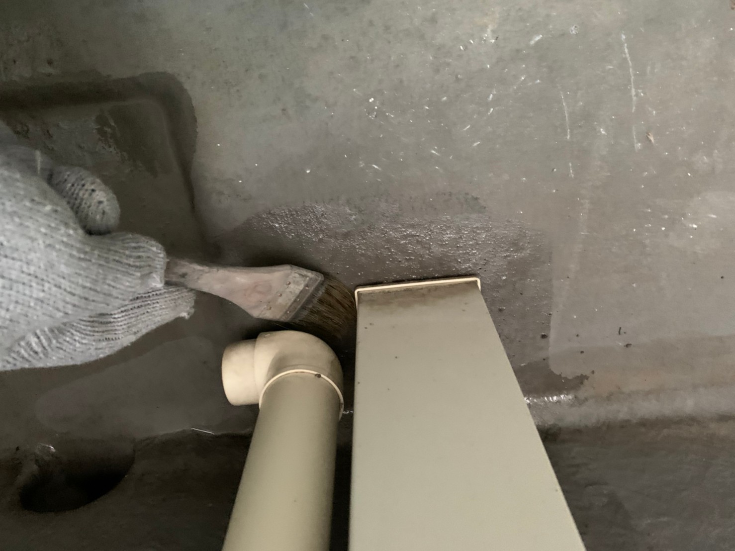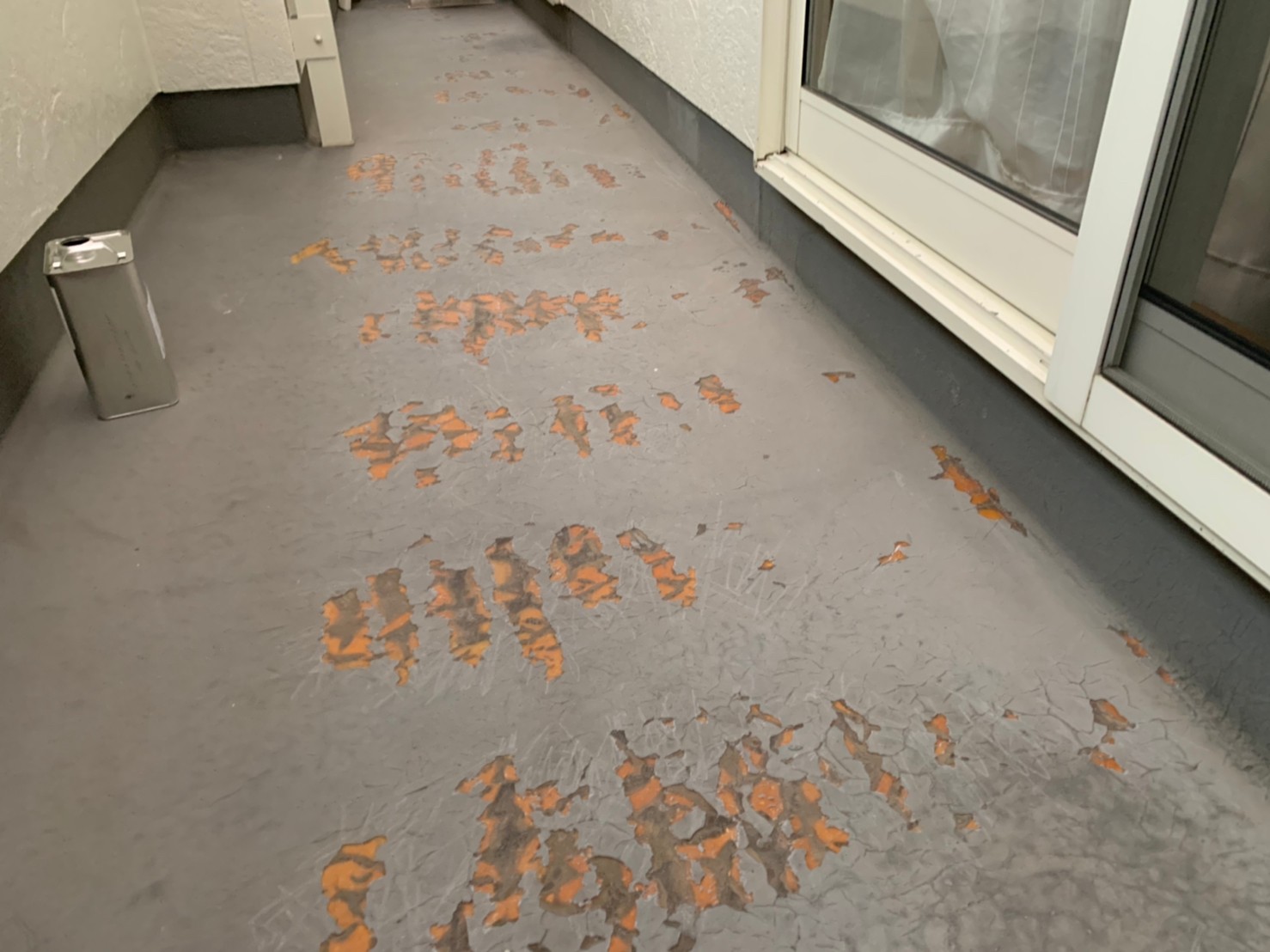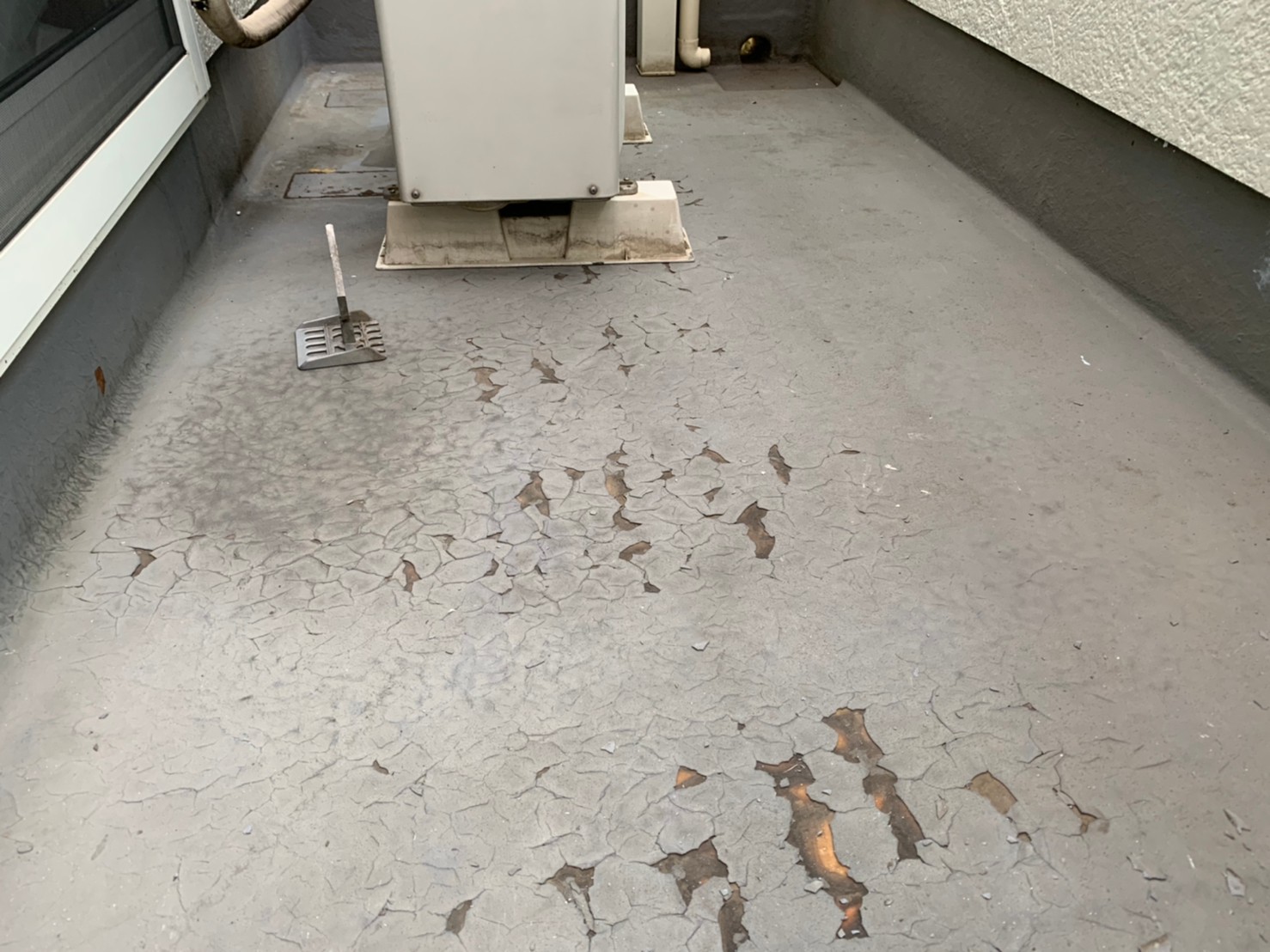 その他にFRP防水塗装をかけるベランダ床の下地調整と清掃後、専用下塗り材を塗装し、後日十分な乾燥後上塗りをかけます。この専用防水塗料も下塗り後、中塗り・上塗りと二回塗装をかけるので十分な塗膜保護となり劣化を防ぎます。