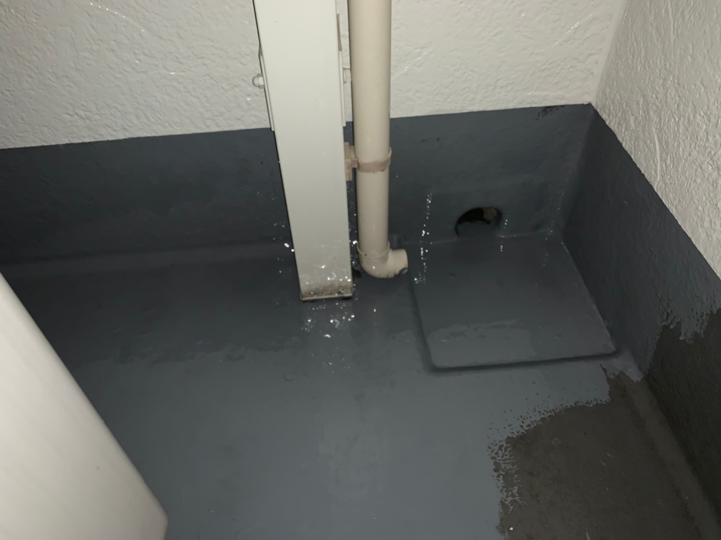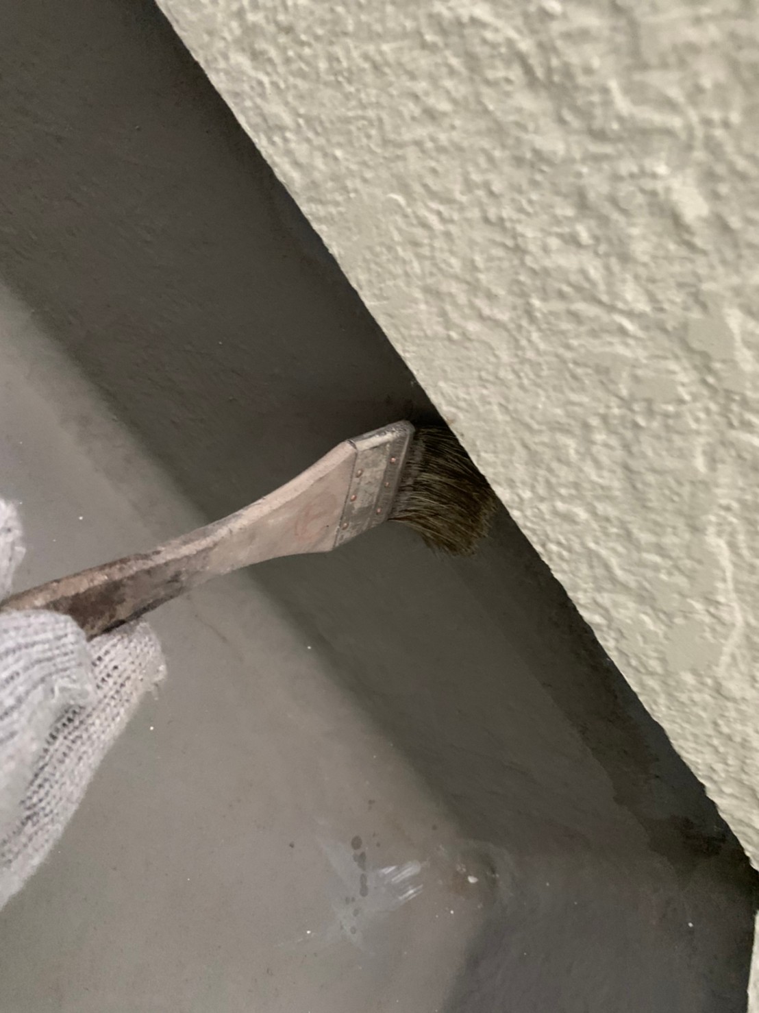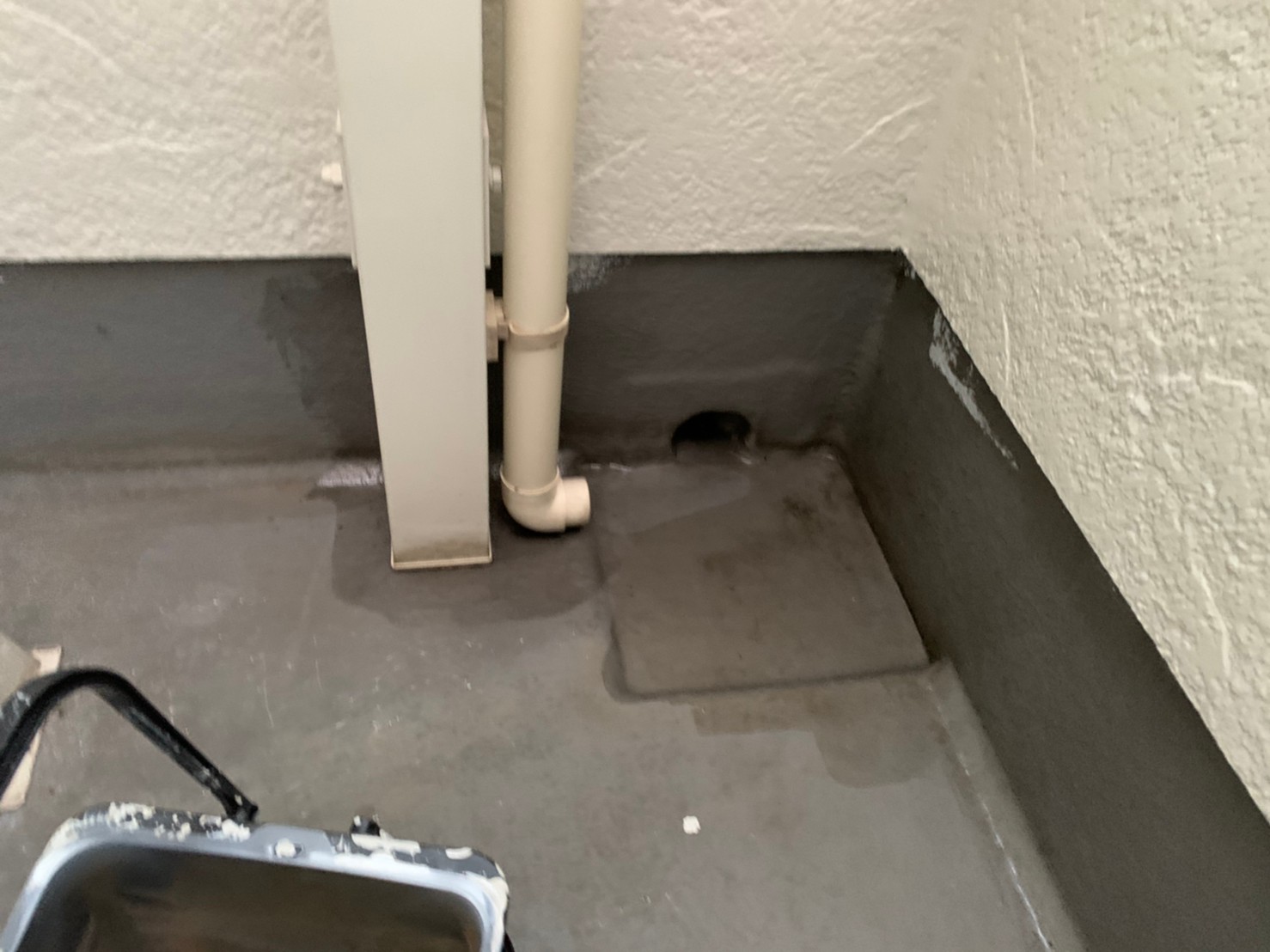その他にFRP防水塗装をかけるベランダ床の下地調整と清掃後、専用下塗り材を塗装し、後日十分な乾燥後上塗りをかけます。この専用防水塗料も下塗り後、中塗り・上塗りと二回塗装をかけるので十分な塗膜保護となり劣化を防ぎます。