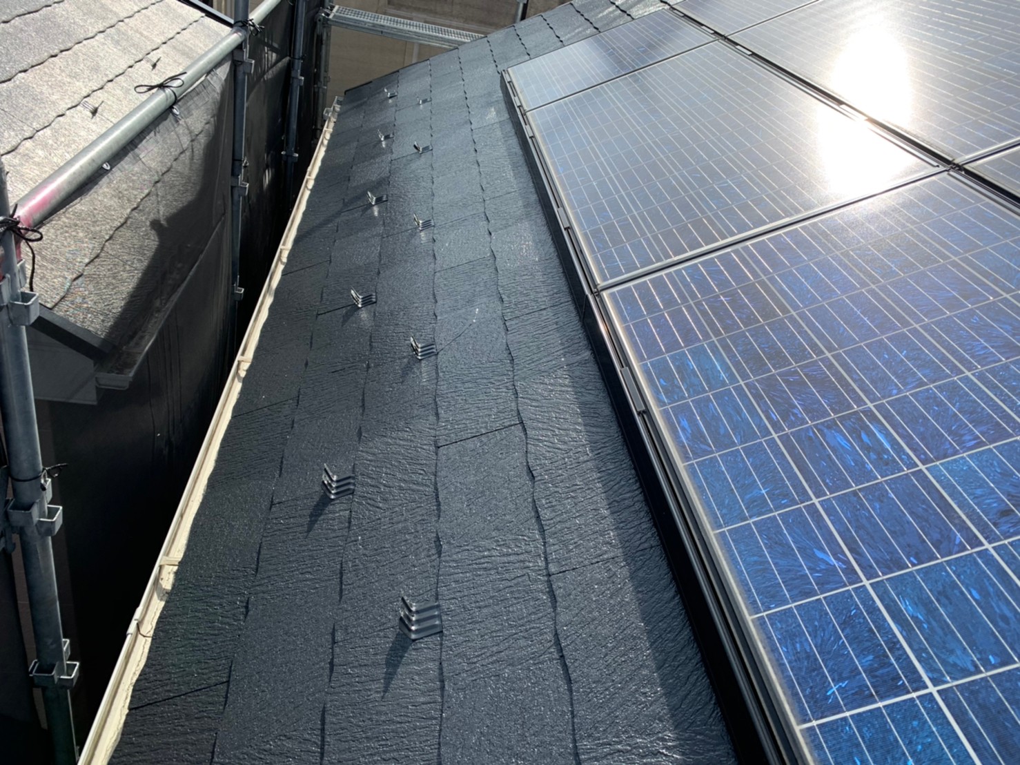 本日N様邸にて屋根の二回目の塗装が完了し、三回目の塗装で仕上がりになります!
