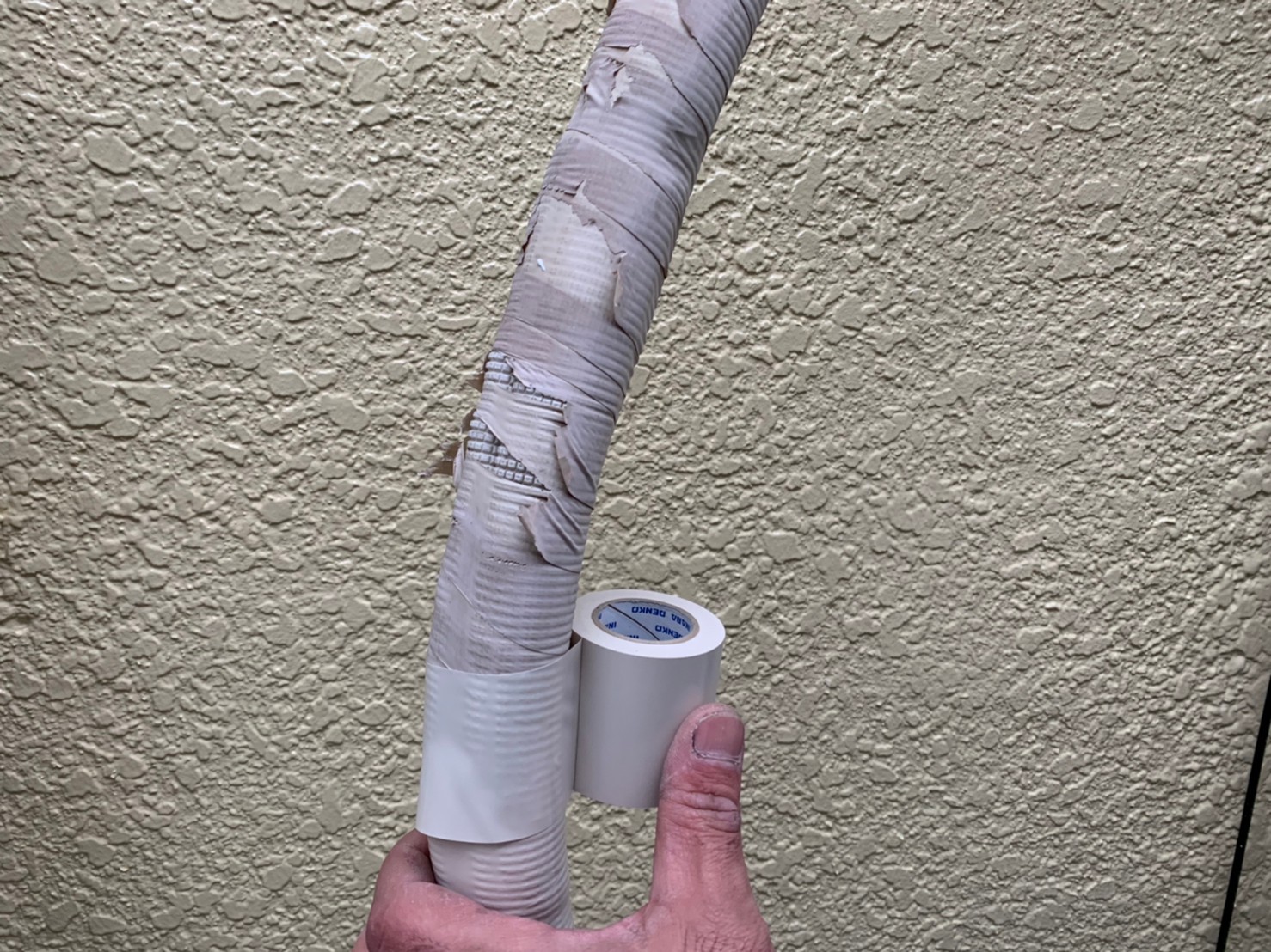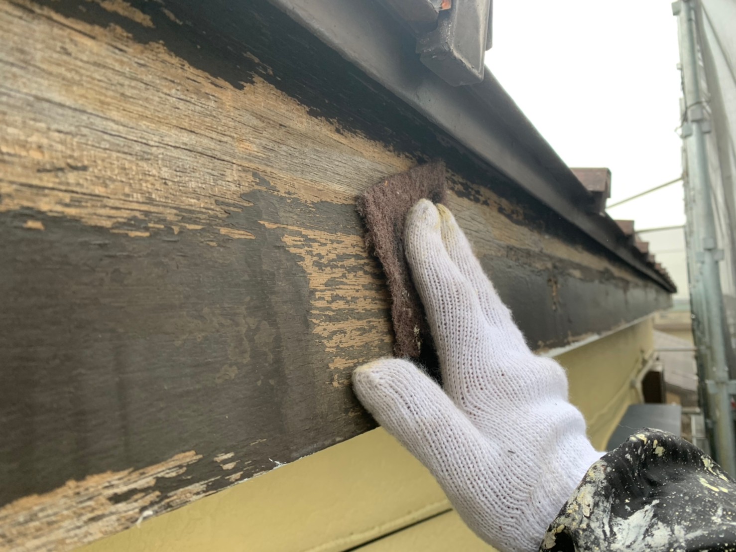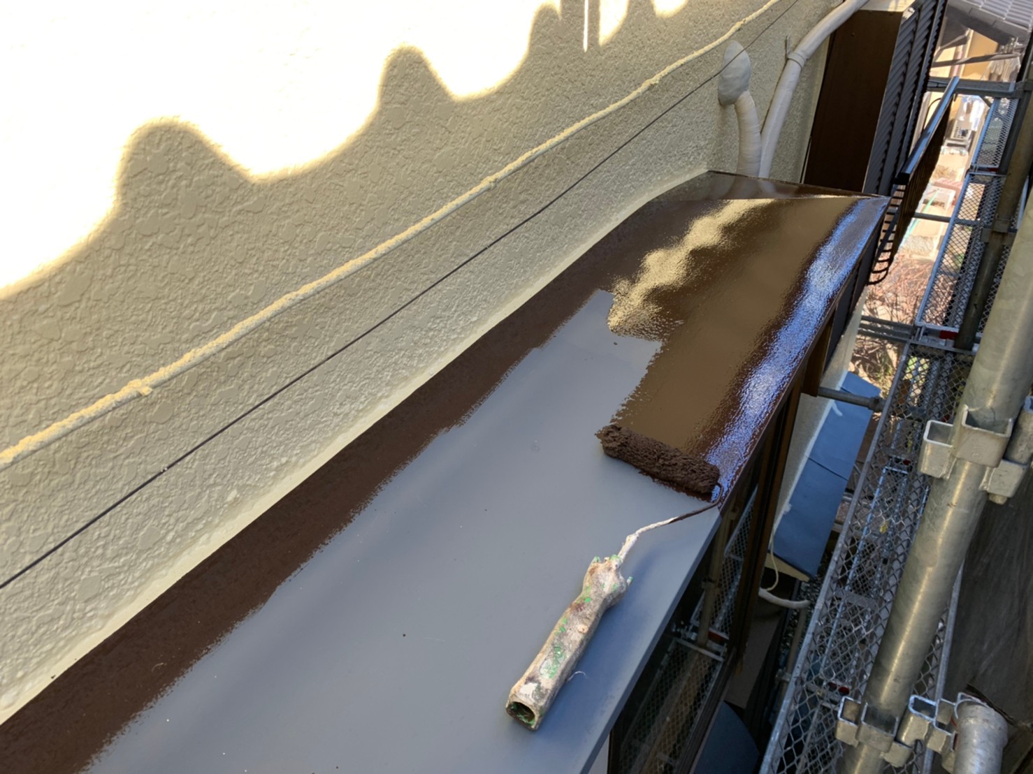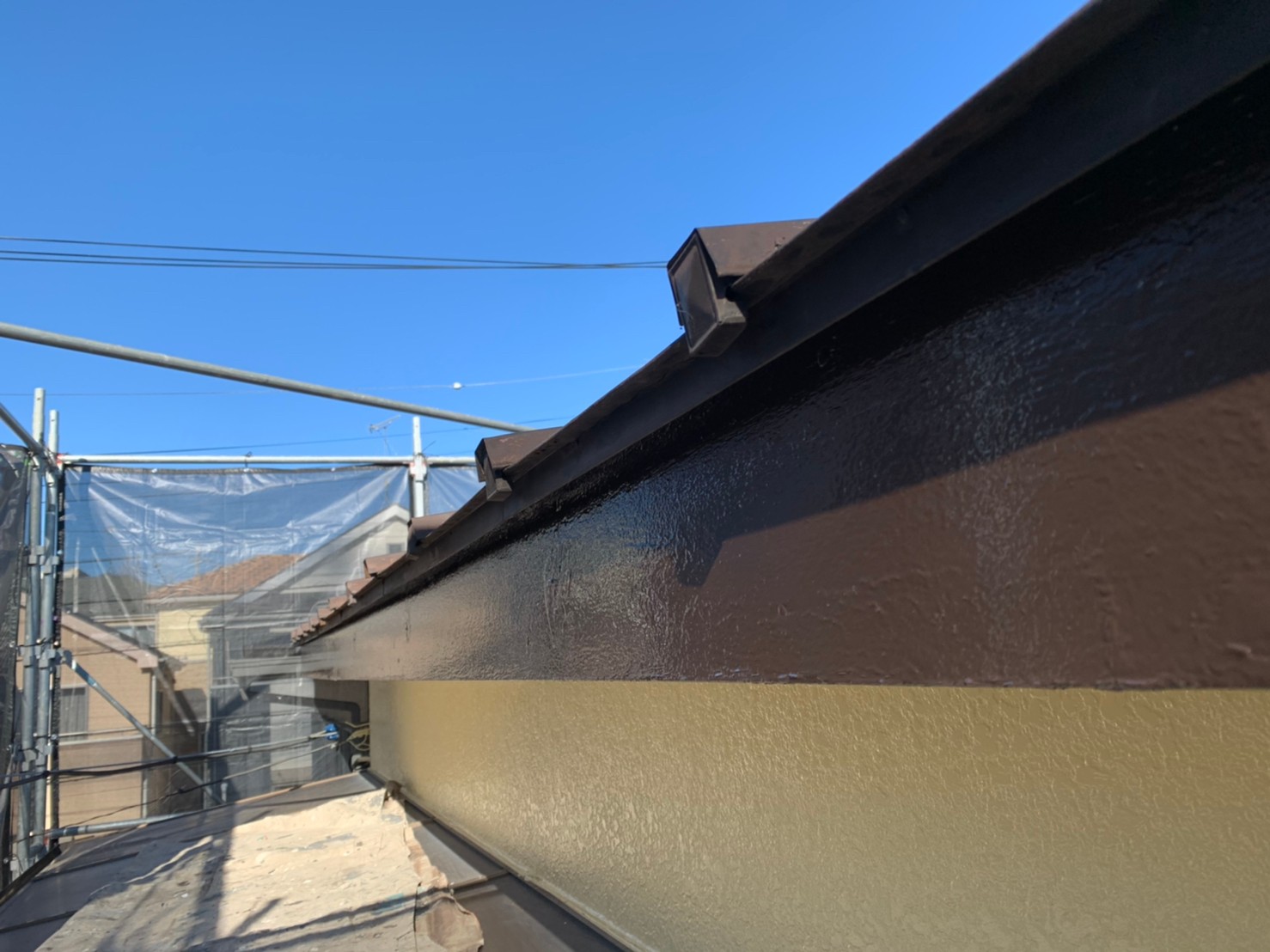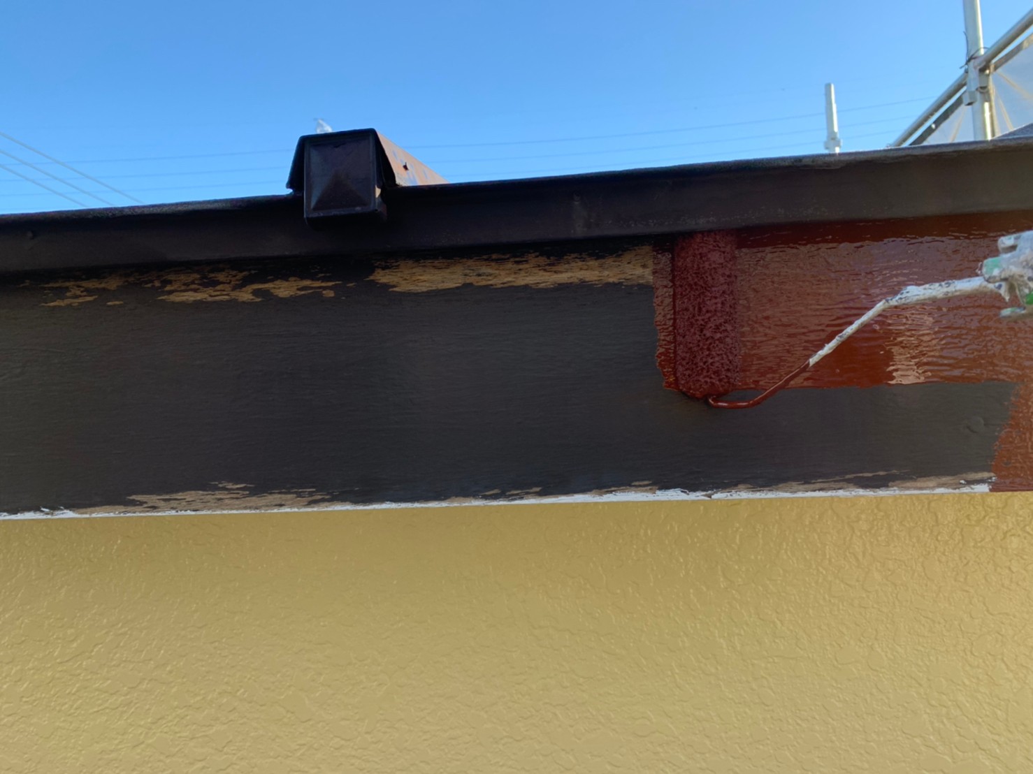埼玉県川越市 O様邸 外壁塗装作業中です。最後の上塗り仕上げ作業が完了し付帯部分を入念に下地処理を施して仕上げていきます。エアコンホースも劣化している為、新規に巻き直して塗装以外の箇所も細かくチェックしていきます。