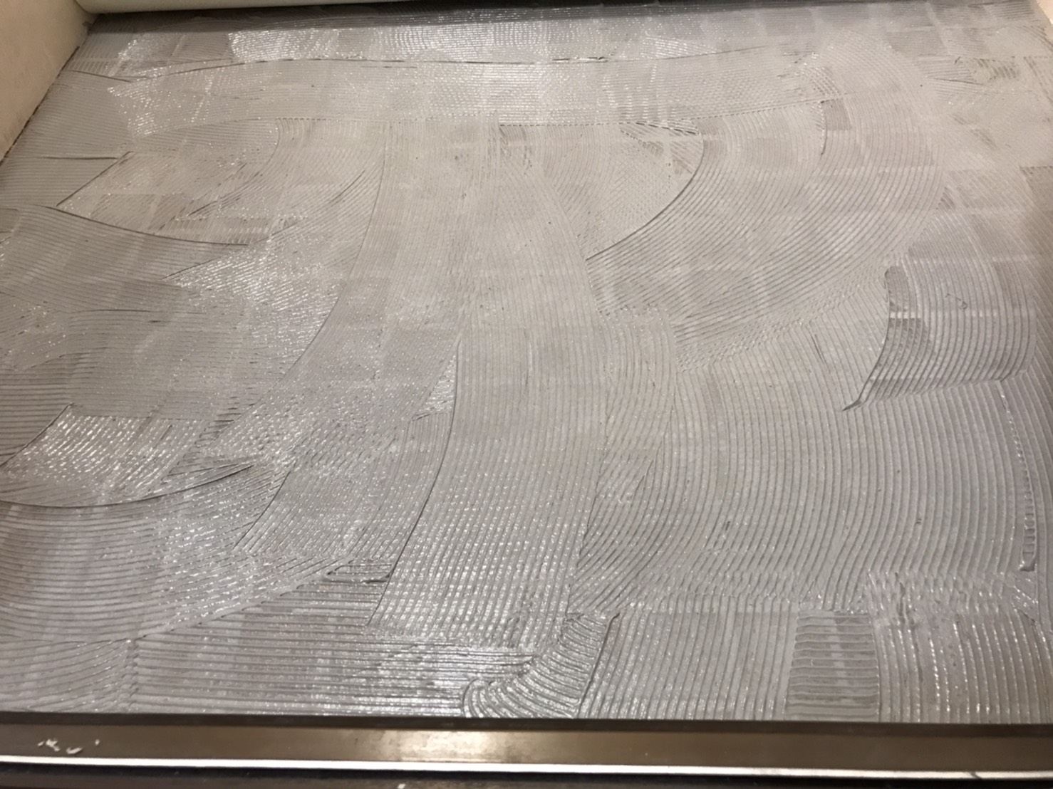 初めに下塗りをしその次に接着剤を塗って、新しいシート床材を貼り付けます。隙間ができる端の部分などはしっかりとコーキング作業を行い完成になります。